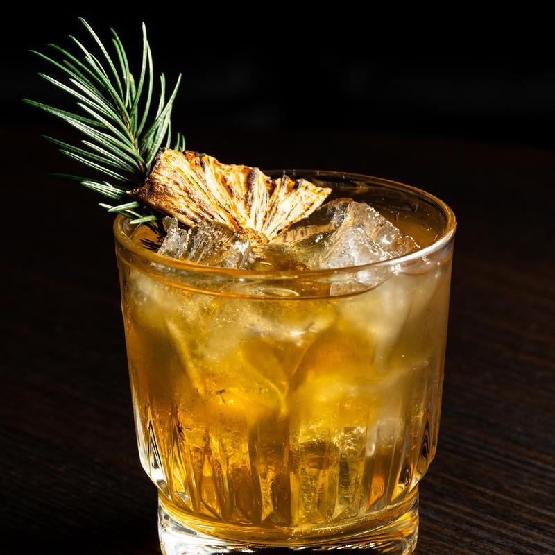 Planteray 5 Year Rum, Argonaut Brandy Infused with Vanilla and Charred Dehydrated Pineapple, Light Brown Sugar Pine Syrup & a Rinse of Lagavulin Scotch.