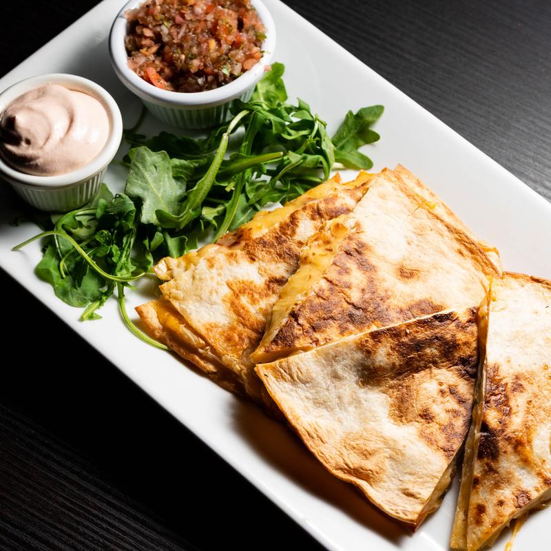 Cheddar and smoked gouda melted with roasted red peppers, red onions & jalapenos. Topped with fresh pico de gallo, sriracha sour cream & baby arugula.
