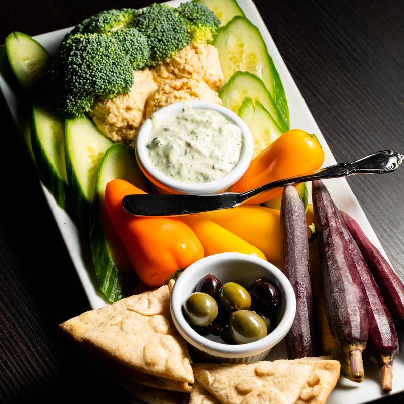3 scoops of our house hummus served with tzatziki, fresh veggies & warm pita bread | Vegan if tzatziki is removed.