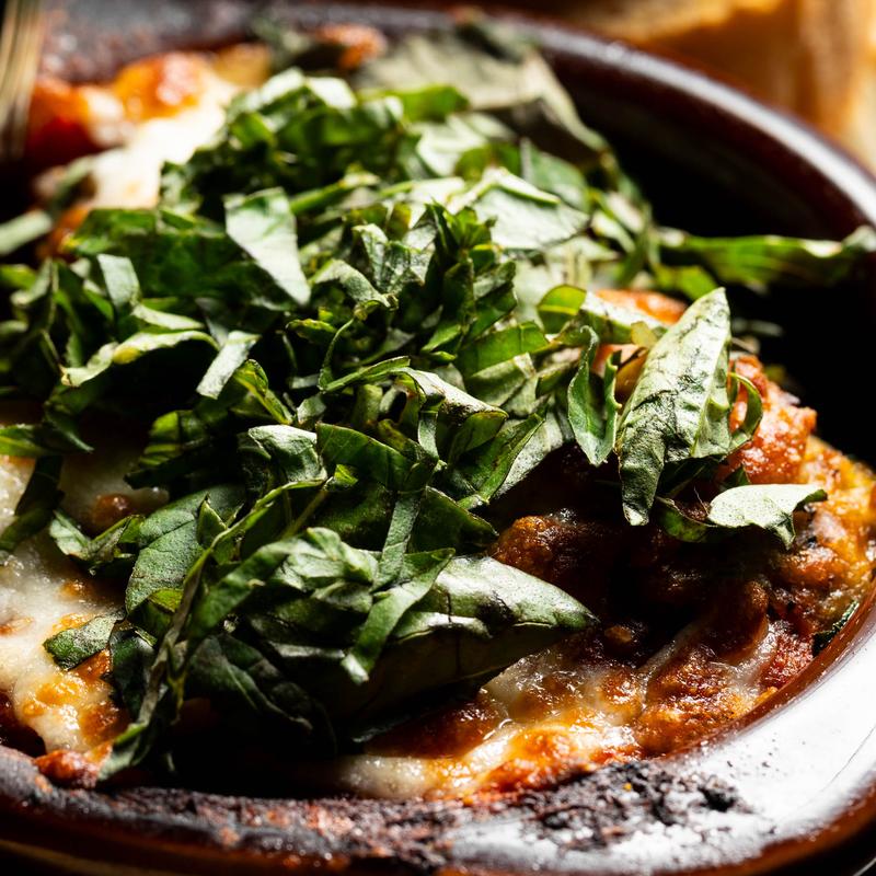 Goat cheese baked in our house marinara. Served with basil & crostini.